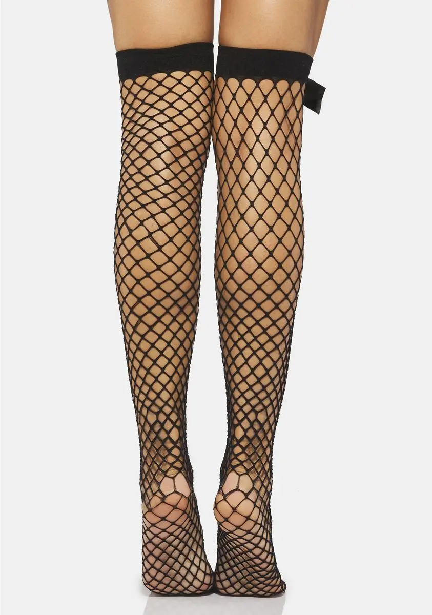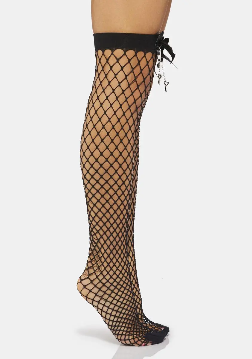 endlessly devoted to you! These thigh highs have a fishnet design with decorative bows and silver heart and key charms.